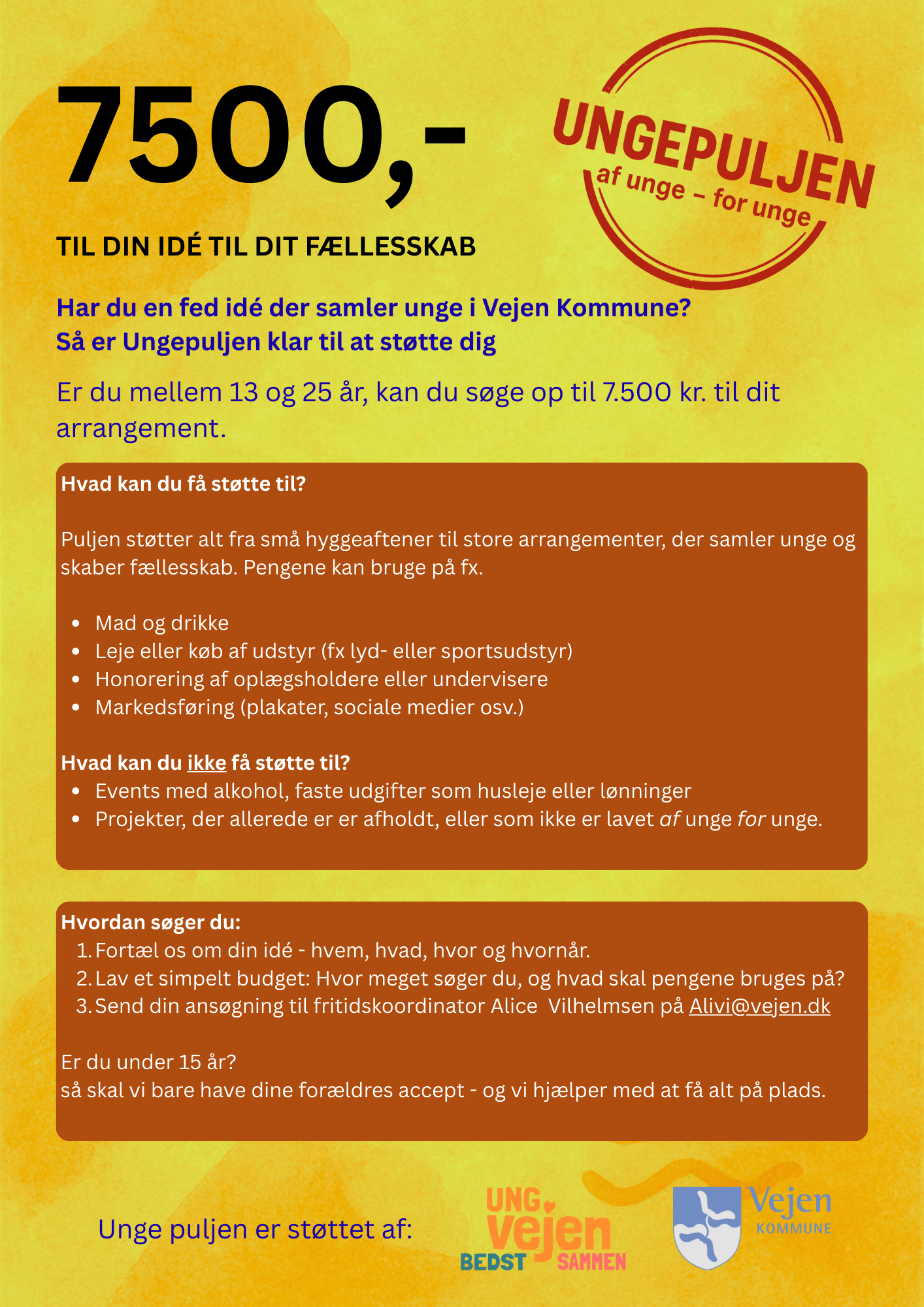 Har du en fed idé der samler unge i Vejen Kommune? Så er Ungepuljen klar til at støtte dig! Er du mellem 13 og 25 år, kan du søge op til 7.500 kr. til dit arrangement. Puljen har 50.000 kr. om året, og der er ingen ansøgningsfrist – du kan søge, når det passer dig.